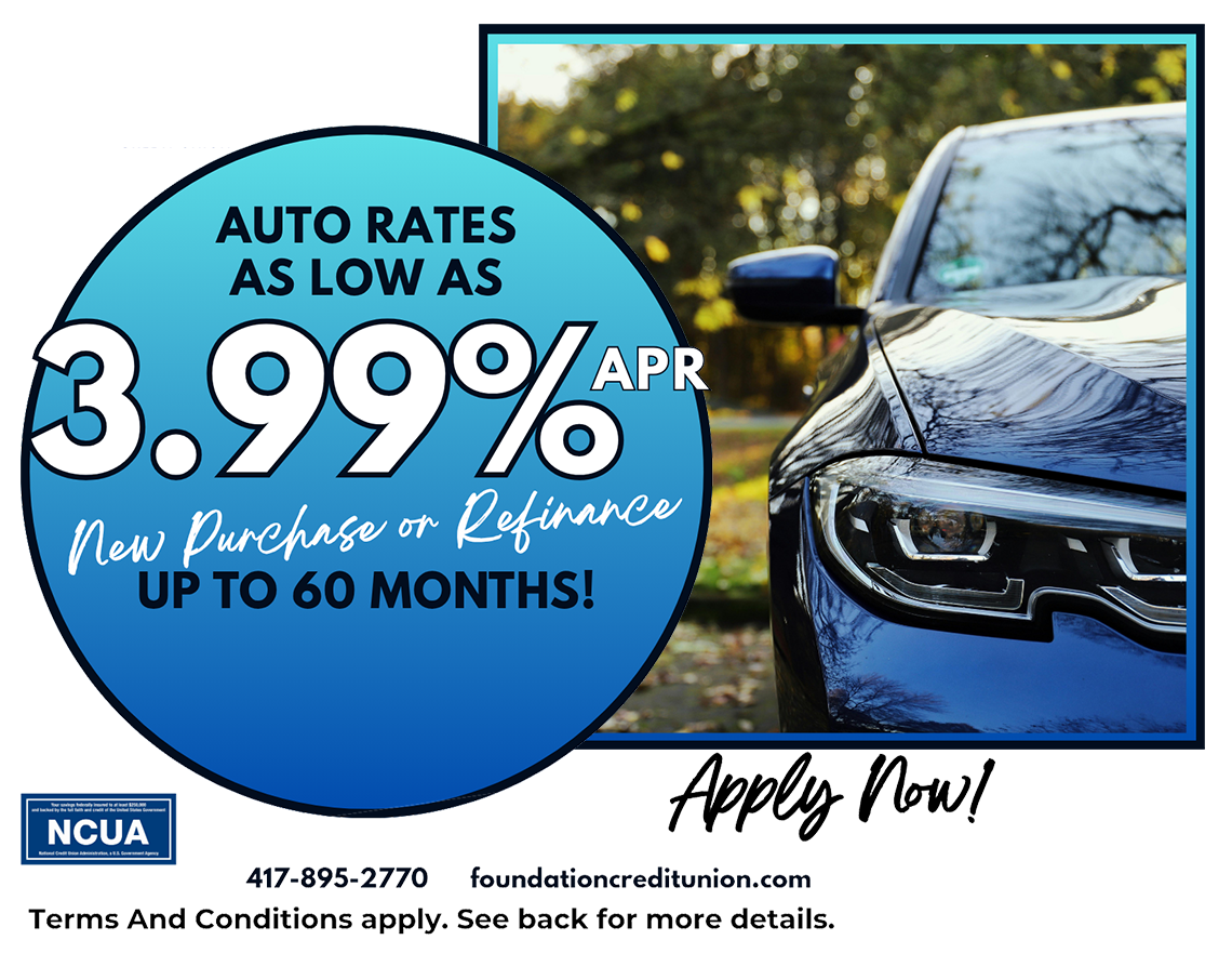 Loans must be new to Foundation Credit Union. Vehicle must be 2018 or newer. Promotion cannot be combined with other offers. Loans are subject to creditworthiness. Rates are subject to change. Member must be in good standing. Credit Union membership required. Offer subject to change or could be cancelled at anytime. Offer good through 5/31/25. Other Terms and Conditions may apply. Contact us today to get started!